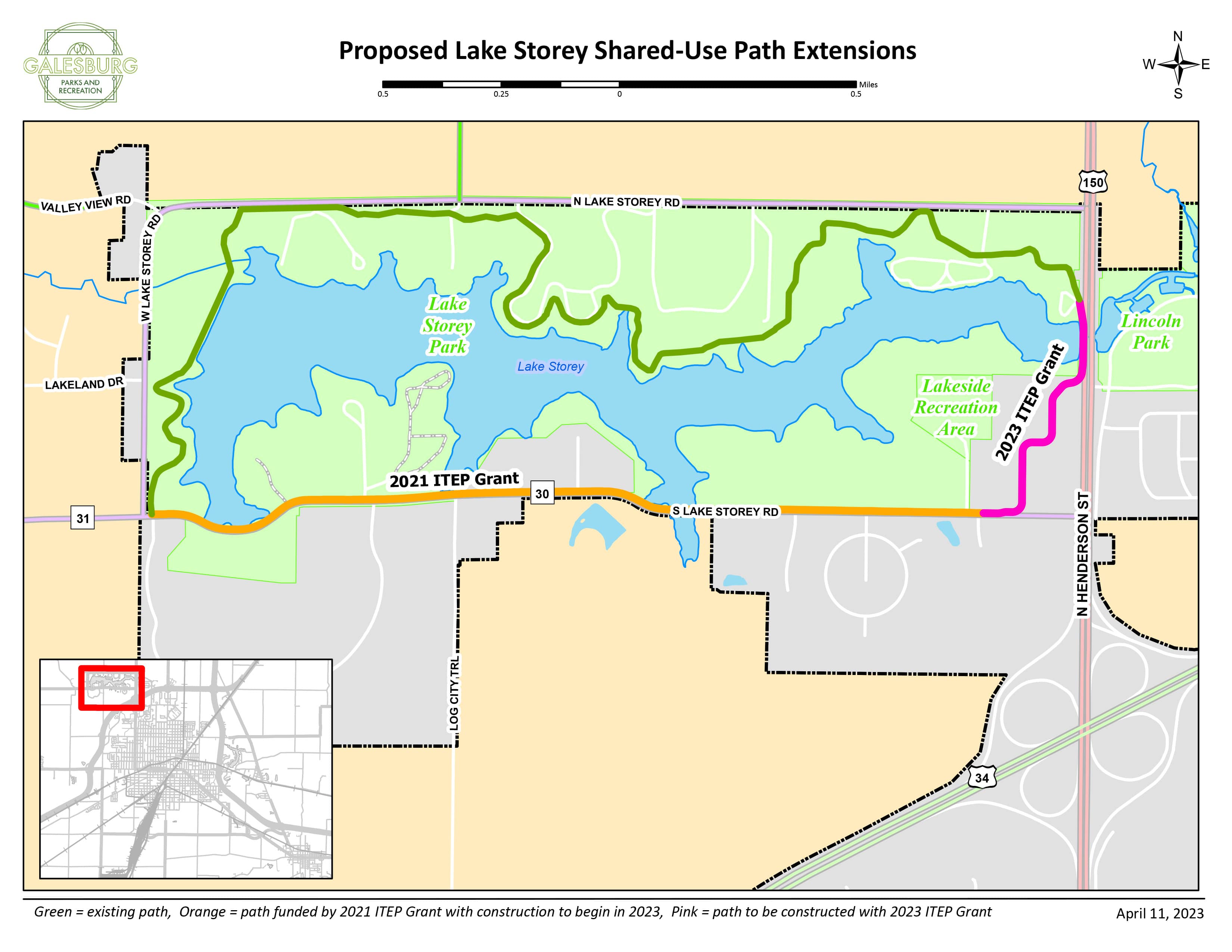 The City of Galesburg has been awarded $655,560 in funding through the ITEP grant to construct a pedestrian and bike path along US 150, which will connect with the walking/biking path around Lake Storey. The grant received will cover 90% of the estimated project cost, with the city paying the remaining 10% of the project cost.