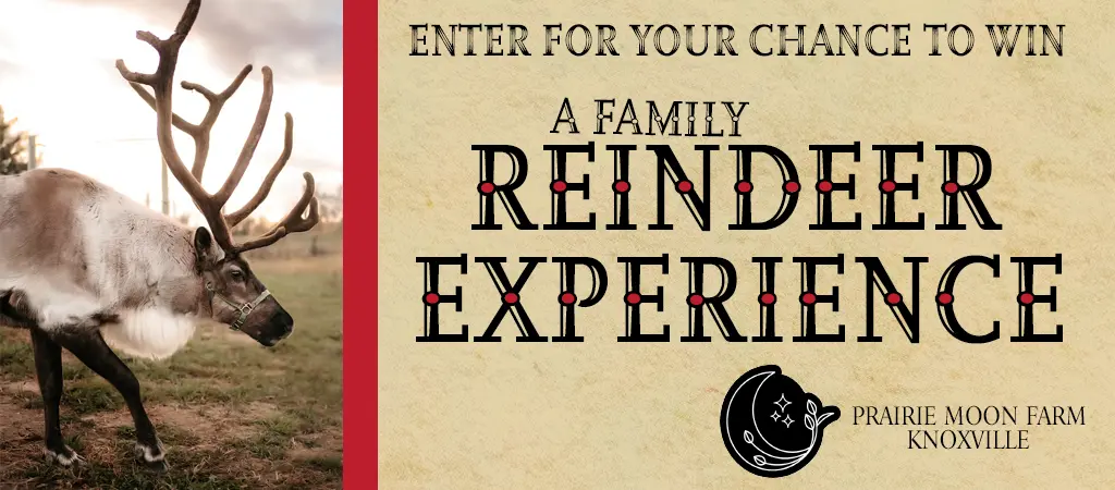 To win, enter for a chance to win a qualifying prize — a Reindeer Encounter Gift Certificate. Then a grand prize winner will be drawn from all the qualifiers for the full Family Reindeer Experience at Prairie Moon Farm in Knoxville. Enter once a day to increase your chances at winning. We’ll draw out the winners on Wednesday, November 26th.